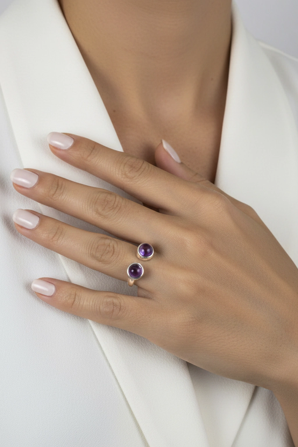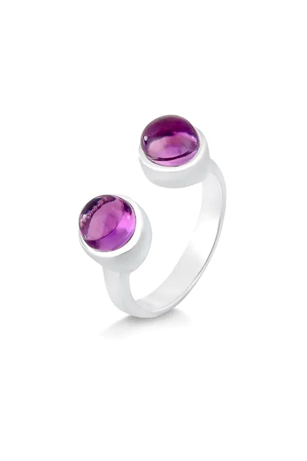 O design moderno do anel é ajustável (modelo open ring), garantindo conforto e adaptabilidade a diversos tamanhos de dedos. A peça é adornada com duas pedras de Ametista, lapidadas em formato cabochão redondo de aproximadamente 6,5 mm cada. O acabamento em Prata 925 ressalta o tom violeta místico da Ametista, criando um visual impactante e harmonioso.