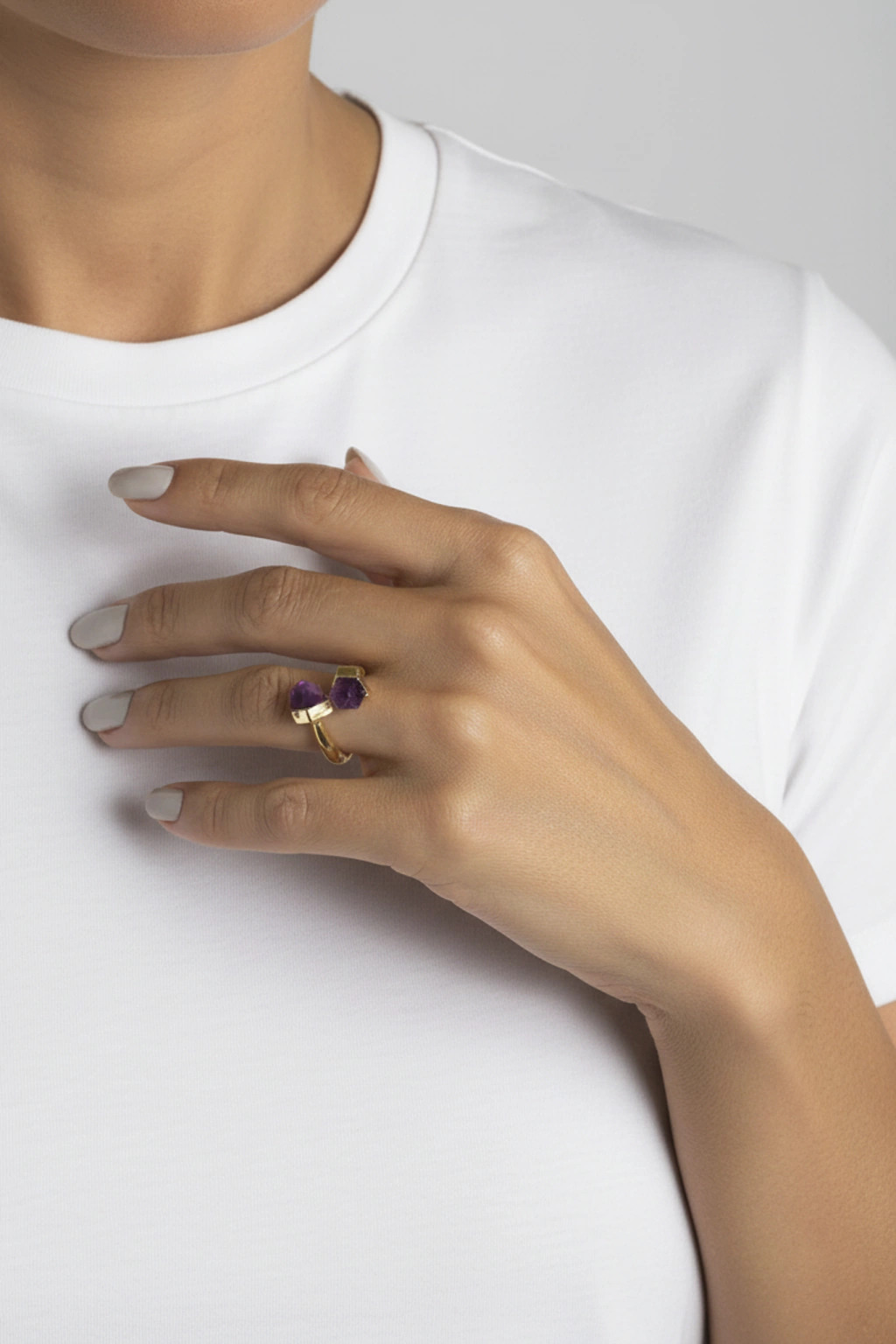 O charme deste anel reside na sua lapidação: uma pedra principal de Ametista em ponta facetada, com duas pedras menores facetadas em cada lateral, realçando o brilho e a geometria da peça. Por ser ajustável, ele se adapta perfeitamente ao seu dedo, garantindo conforto e estilo.