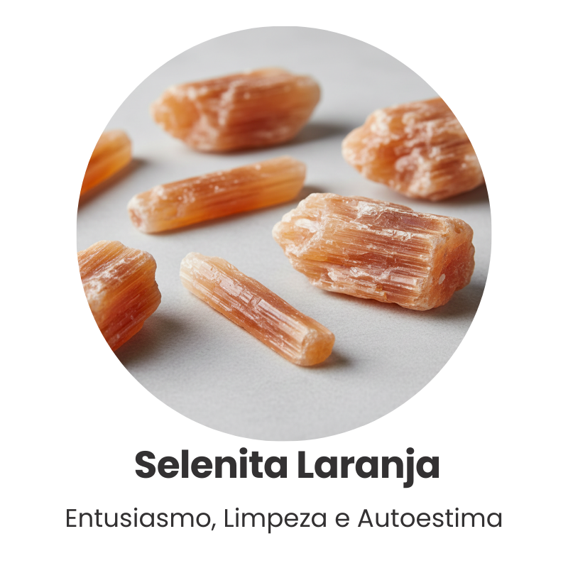 Selenita Laranja Bruta: Diferente da versão branca, a Selenita Laranja vibra na energia do plexo solar e do sacral. Ela é uma poderosa aliada para aumentar a autoestima, desbloquear a criatividade e trazer um sentimento profundo de bem-estar e segurança.